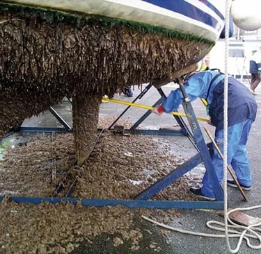 La acumulación de algas, moluscos y suciedad (fouling) aumenta la resistencia al avance y puede dañar la pintura o los sensores del casco.
